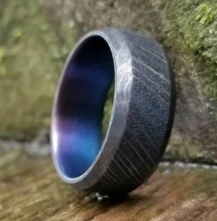This listing is for a really cool FLAME anodized Stainless Damascus Steel band. Damascus is a very special ring material that is made by super heating and forge welding two or more different types of stainless steel together. The base ring, being stainless Damascus is already awesome enough, however, we decided to up the cool factor even more by taking a propane torch to it! This results in some truly awesome color combinations and makes these rings even more unique! These are really fun for us to make and we love making them so order yours today!