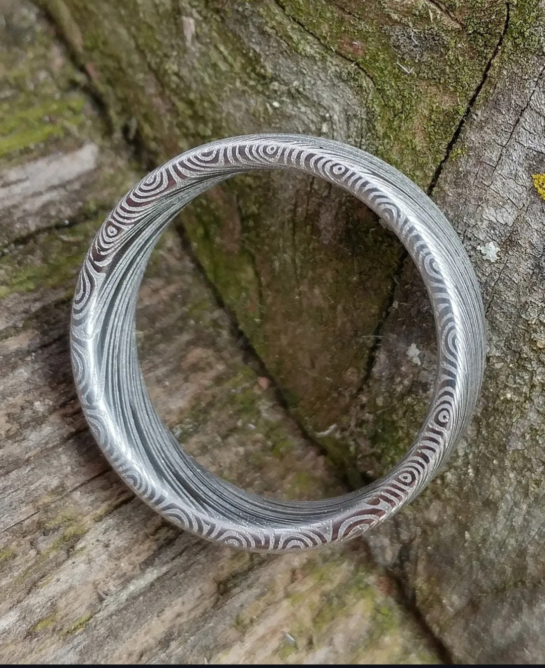 This listing is for an absolutely stunning heimskringla pattern stainless damascus ring. Named for the Norse god of gods, Odin, this ring will truly inspire awe in all that lay eyes upon it. This pattern of Damascus is very difficult to make and is therefore extremely unique! This ring is made by carefully forging two different types of stainless steel together, which we then machine down and finally etch to bring out the awesome pattern! This ring is absolutely stunning in person and you will not regret ordering one. This type of steel is in short supply, so our lead times on this one may vary.
