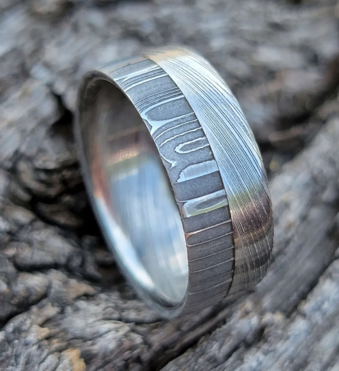 This ring is called The Split Descision. Can't decide between two of our awesome rings? Why not combine them! The ring picture is half Odin ring and Half Reptilian damascus. Let me know which two styles you want to mix and match to make your own truly unique ring!