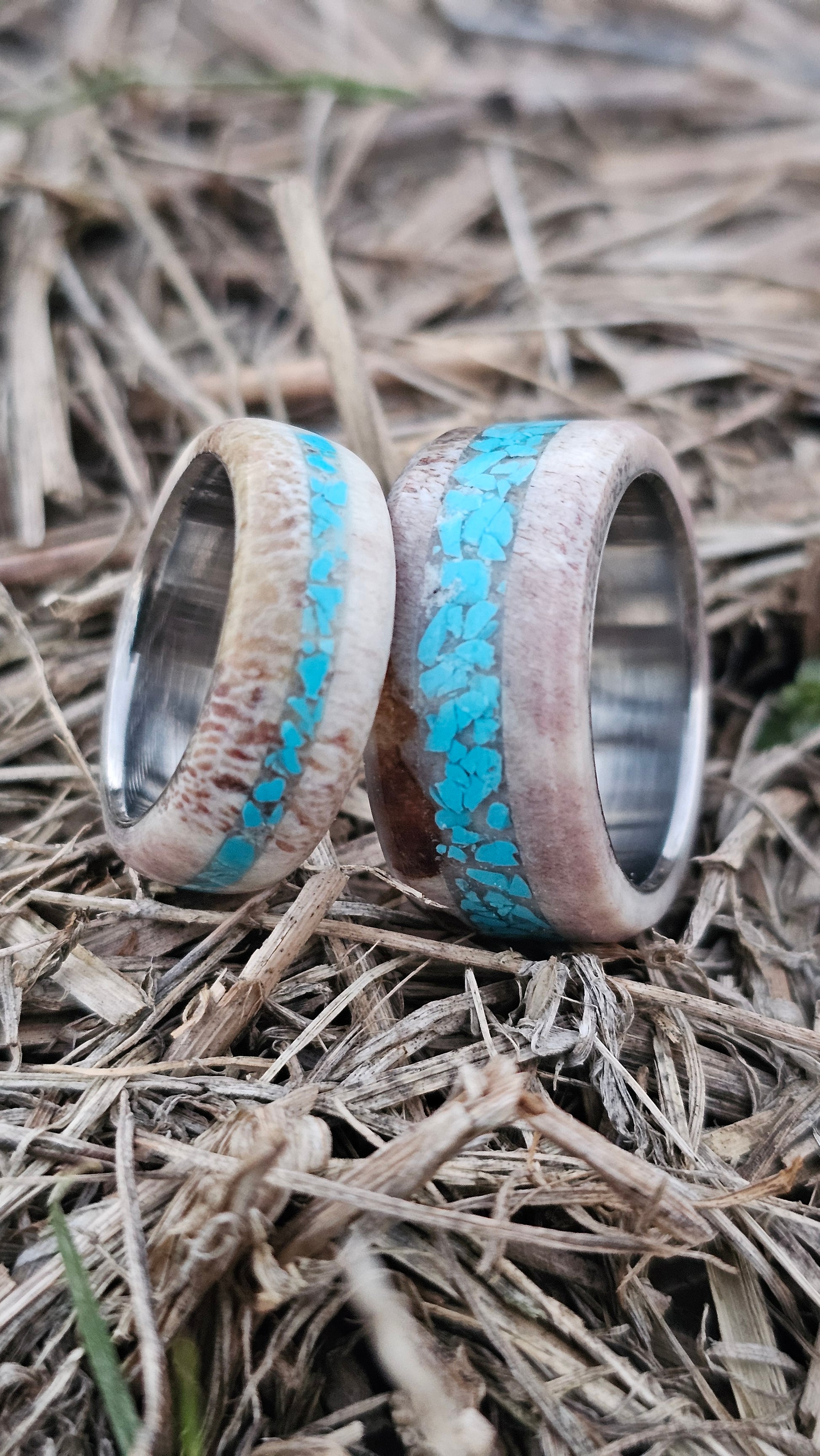 This listing is for one of our brand new titanium and American whitetail deer antler rings...with a turquoise inlay! These are simply awesome! What looks like cracks in the pictures are actually the grain of the deer antler. Stabilized with epoxy, these are strong and durable. Due to the nature of each deer antler being different, no two of these rings will be exactly the same, which I think makes them even cooler!