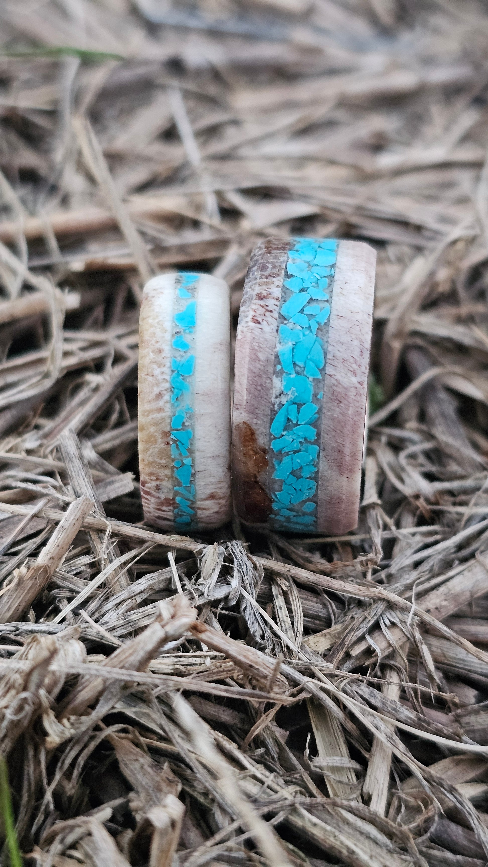 This listing is for a set of our brand new titanium and American whitetail deer antler rings...with a turquoise inlay! These are simply awesome! What looks like cracks in the pictures are actually the grain of the deer antler. Stabilized with epoxy, these are strong and durable. Due to the nature of each deer antler being different, no two of these rings will be exactly the same, which I think makes them even cooler!